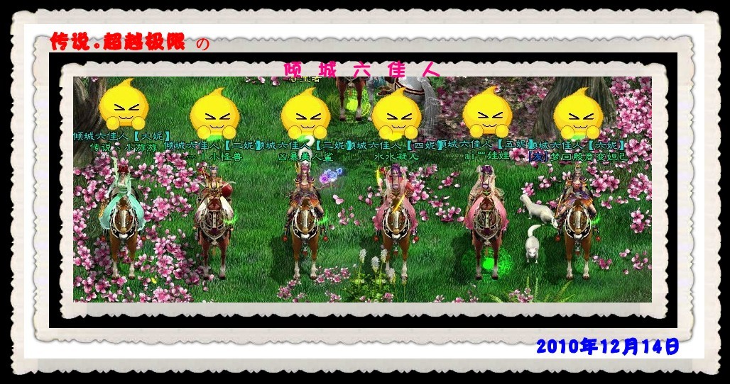 公元2010年12月14日 冬月初九 2010年12月14日23点30分,这是个平常的日子,但这一天却见证了六个人的真情流露,传说丶小游游、灬丨小怪兽、凶暴美人鲨、水水凝儿、ai罒娃娃、梦回殷商变妲己于桃花源关二爷处对天盟誓,义结金兰并取名“倾城六佳人”。