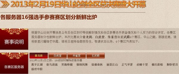 征途2的跨区总决赛将在2013年2月19日,在跨区中,各种层次的玩家将迎来与自己实力差不多的对手,这也使得征途2的华山论剑更加有看点,而在之前,单区的华山论剑冠军也出炉了,在进入决赛之前,让我们来看下各大区的华山论剑冠军。