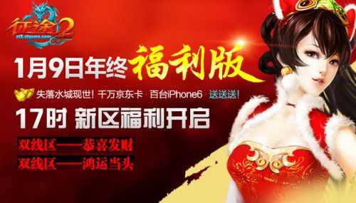 过年了,《 征途2》年终福利资料片将在1月9日上线,千万福利发不停!京东卡、iPhone6、红莲奥义等免费抽,让你***翻天!更有40多重活动伴你过春节,全程送送送!